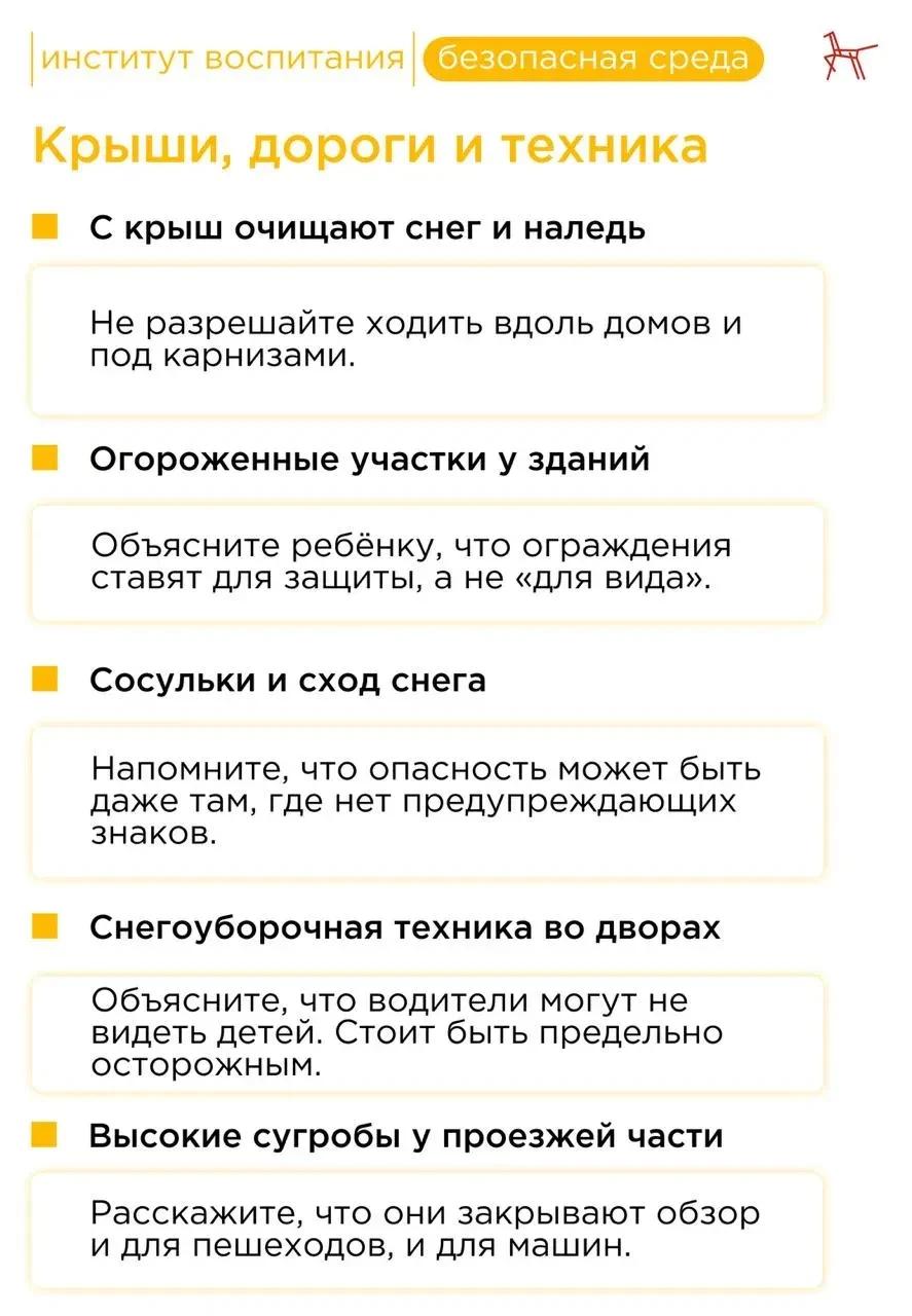 ⚠️ Зимой риск травм увеличивается не только из-за гололёда, но и из-за скрытых под снегом предметов, плохой видимости и работы тяжёлой техники. Важно заранее обсудить с ребёнком правила безопасного поведения.