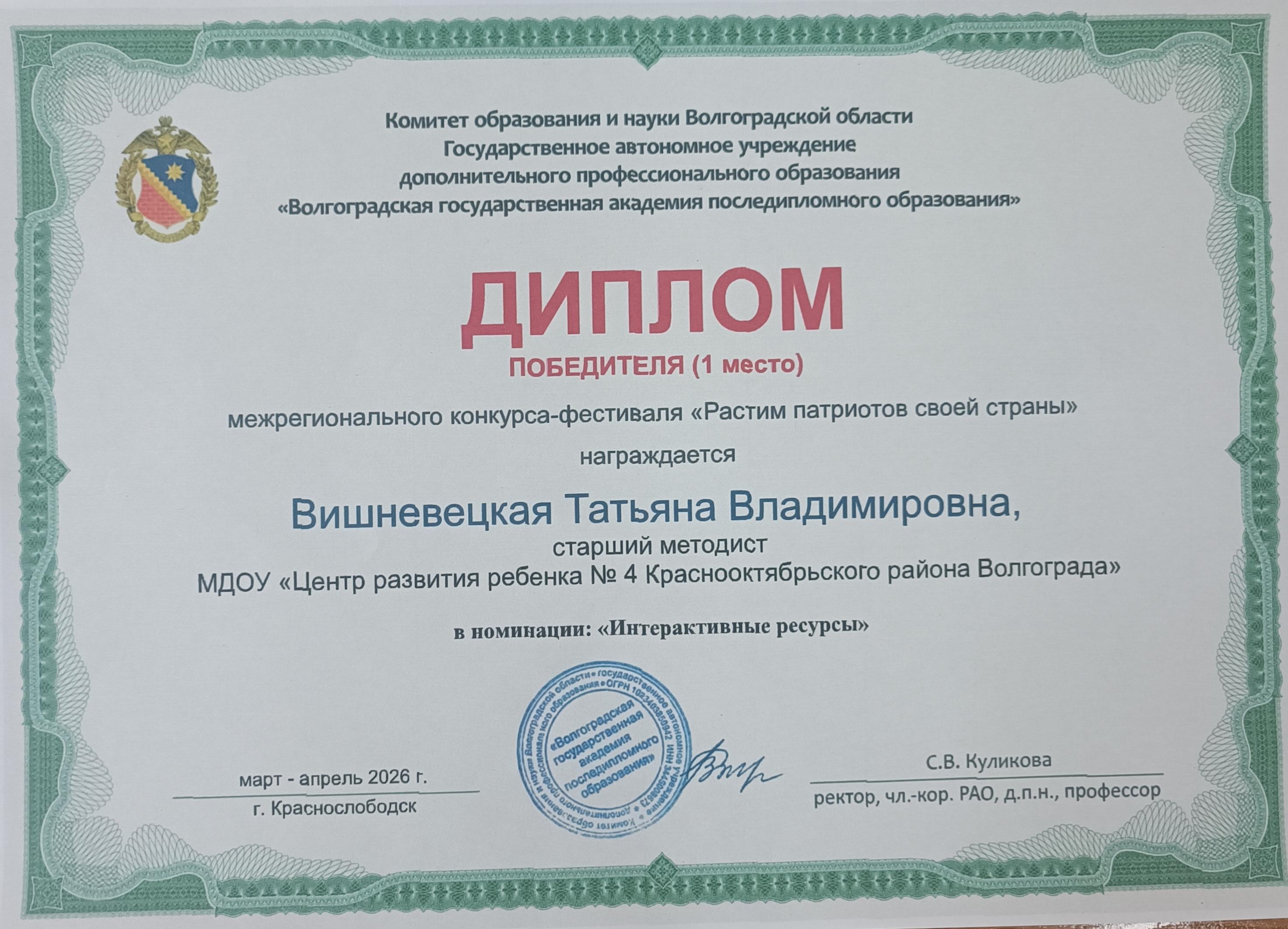 Педагоги МОУ Центр развития ребенка № 4 -старший воспитатель Яковлева Ирина Александровна и старший методист Вишневецкая Татьяна Владимировна стали победителями межрегионального конкурса-фестиваля "Растим патриотов своей страны" в номинации "Интерактивные ресурсы". Поздравляем педагогов с победой и желаем дальнейших профессиональных успехов, новых ярких достижений и неиссякаемого вдохновения!