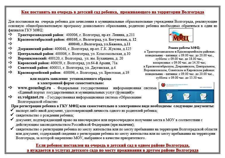 Прием заявлений с документами, необходимыми для регистрации ребенка в едином электронном реестре Автоматизированной информационной системы «Реестр очередности будущих воспитанников МДОУ Волгограда» (далее – АИС), осуществляют: — «Многофункциональный центр по предоставлению государственных и муниципальных услуг» (далее — МФЦ) — при личном обращении заявителя; — территориальное управление департамента по образованию администрации Волгограда (далее — ТУ ДОАВ) — при самостоятельном обращении заявителя в электронной форме путем заполнения специальной интерактивной формы на Информационно — справочном портале Волгограда www.volgadmin.ru и федеральную государственную информационную систему «Единый портал государственных и муниципальных услуг (функций)» www.gosuslugi.ru , в том числе с использованием с универсальной электронной карты.